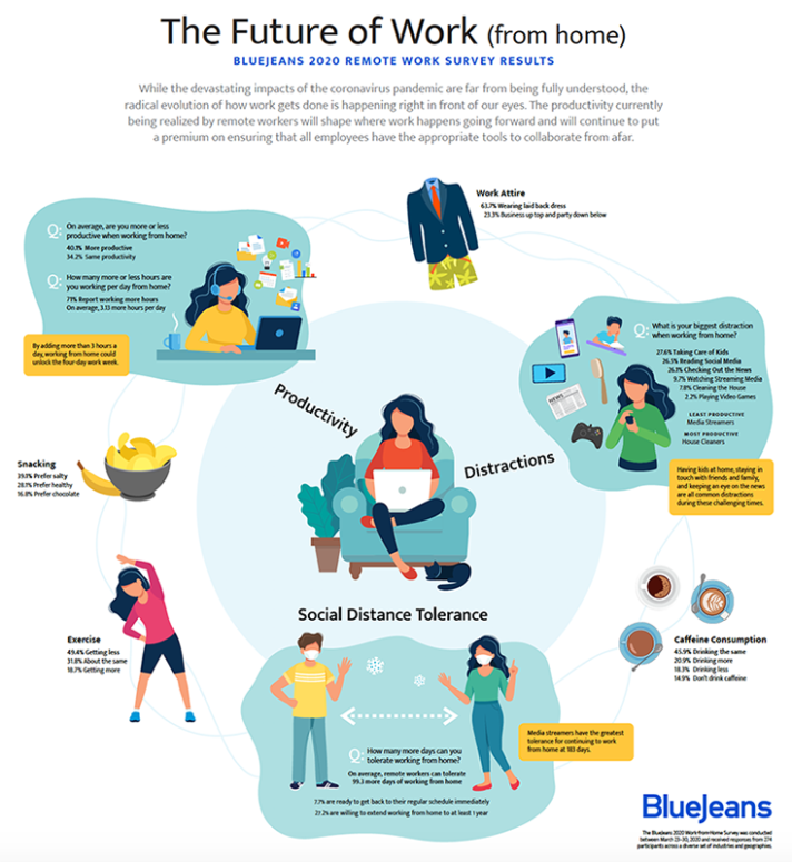 คนทั่วโลกยังคงต้องเวิร์คฟรอมโฮมกันอีกสักพักหากทำได้ งานสำรวจชิ้นหนึ่งของ BlueJeans เผยว่าผู้ตอบแบบสอบถามจำนวน 63.7% แต่งตัวสบายๆ เวลาอยู่กับบ้าน ในขณะที่ 23.3% แต่งตัวเป็นทางการเพียงแค่ท่อนบนที่กล้องมองเห็น สิ่งรบกวนการทำงานที่บ้าน ได้แก่ การต้องดูแลบุตรหลาน (27.6%) การดูโซเชียลมีเดีย (26.5%) และการติดตามข่าวสารต่างๆ (26.1%) แม้กระนั้น ผู้ตอบแบบสอบถามจำนวน 40.1% ยังระบุว่าตนทำงานได้โดยมีผลิตผลดีกว่าเวลาอยู่ที่ออฟฟิศ ในขณะที่อีก 34.2% ระบุว่าตนทำงานได้ผลิตผลเท่าเทียบกับเวลาอยู่ที่ออฟฟิศ