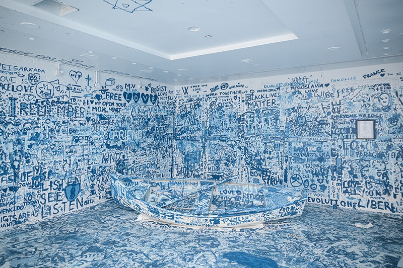 Yoko Ono’s Add Color (Refugee Boat 1960/2019) invites the audience to partake in the peace process.