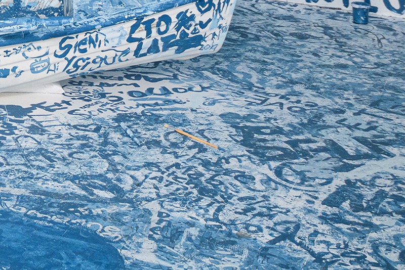 วันแรกของการแสดงงานเรือพายสีขาวถูกนำมาวางไว้ในห้องโถงขนาดใหญ่สีขาว มีพู่กันและสีฟ้าใส่กระป๋องรอให้ผู้ชมเข้ามามีส่วนร่วมด้วยการวาดรูปหรือเขียนถ้อยคำที่อยู่ในความคิดคำนึงของพวกเขาลงบนผนัง พื้นห้อง หรือแม้แต่บนตัวเรือเองก็ตาม จากแฮชแท็ก #yokoono ในอินสตาแกรมพบว่าเพียงสองวันเท่านั้นทั้งห้องก็กลายเป็นท้องทะเลแห่งข้อความและรูปวาดสีฟ้าที่มีความหลากหลายทั้งความคิดและภาษา ทั้งหมดเป็นใจความสำคัญในผลงานของโอโนะ เนื่องจากในช่วงหลังนี้ดูเหมือนว่าปรัชญาในการทำงานของเธอคือการแสวงหาจุดสมดุลระหว่างผู้คนแต่ละเชื้อชาติ และระหว่างสงครามกับสันติภาพด้วย