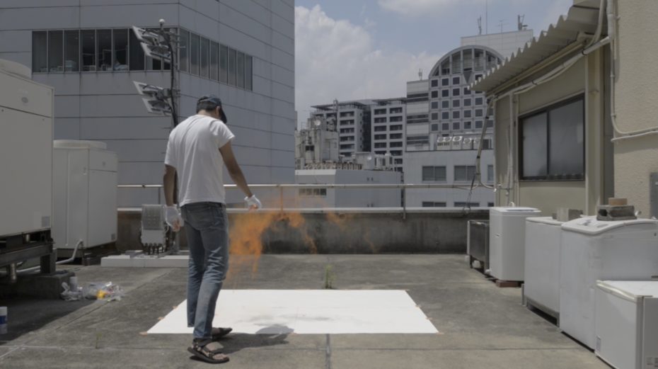 Ruangkritya spread heavy industrial waste in the air on a rooftop in Shibuya, Tokyo. Image courtesy of Miti Ruangkritya, 2017