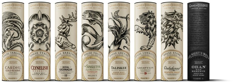 แต่สำหรับแฟนตัวยงและนักสะสม ก็มีคอลเลคชั่น Game of Thrones Single Malt Whisky โดยนักสะสมก็จะได้เห็นสัญลักษณ์ของแต่ละบ้านบนทุกขวด โรงกลั่นที่ถูกเลือกก็จะเป็นโรงกลั่นที่มีประวัติศาสตร์ที่เหมือนกับบ้านแห่ง Westeros ยกตัวอย่างเช่นโรงกลั่น Talisker จาก Isle of Skye – หนึ่งในพื้นที่ที่ขรุขระที่สุดแห่งสกอตแลนด์ถูกจับคู่กับบ้าน Greyjoy แห่ง Iron Islands โดย Talisker Select Reserve นั้นโดนเด่นในรสชาติที่ชัดเจน มีกลิ่นควัน และมีรสชาติทะเล ๆ ซึ่งทำให้นึกถึงความสัมพันธ์ระหว่างบ้าน Greyjoy กับทะเลอันแสนโหดร้าย