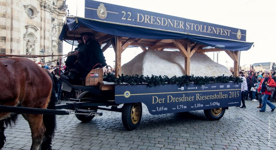 The most famous Stollen Cake, believed to be the original, can be found in Dresden, Germany. To authenticate the Stollen Cake, a special certification system has been put in place, and genuine “Dresdner Christstollen” Cakes are awarded The Golden Stollen Seal. Only 120 bakeries in Dresden are holders of this seal. In addition, the city of Dresden celebrates Stollens at the Christmas Market (Dresden Striezelmarkt), known as one of the oldest outdoor markets in Europe, having existed since 1434. At the event, a giant Stollen Cake will be paraded with a historic horse-drawn carriage along with a traditional knife designed specifically to cut it. The parade also features the year’s “Stollen Girl” or “Stollenmädchen”.