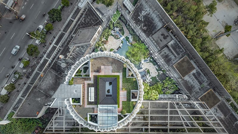 With a complex exterior and simplified interior, the Eight Tenths Garden is described as the picture perfect representation of the metropolis’ rich yet restrained nature. A replica of the monumental ‘70s Shanghai park surrounds the building boasting immaculate greenery, stone pathways and clear blue ponds. Its cylindrical structure is clad in pleated white perforated-aluminum, similar to the subtle folds of a traditional fan.