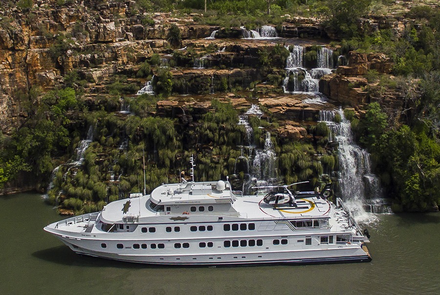 Purposely built for agility (translated: a smaller than is usual for a luxury travel vessel), the 50-metre long cruise has the ability to navigate and traverse hard-to-reach locations, ensuring guests get into the thick of the wilderness of places such as King George Falls, Montgomery Reef and the Horizontal Waterfalls. With vessels outfitted with a sundeck and a forward observation lounge with dining rooms featuring panoramic windows, one is never far away from the great outdoors. Daily activities include scenic walks, fishing, snorkelling, diving and cultural events.
