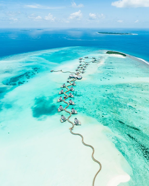 รีสอร์ทใหม่ล่าสุดของ Soneva ที่มัลดีฟส์มีชื่อว่า Soneva Jani เพิ่งเปิดให้บริการเมื่อสามปีก่อนนี้เองในปี ค.ศ. 2016 รีสอร์ทแห่งนี้ตั้งอยู่ทางเหนือของมาเลซึ่งเป็นเมืองหลวง จะต้องนั่งเครื่องบินน้ำต่อไปโดยใช้เวลา 40 นาที ระหว่างนั้นก็ดูวิวเพลินๆ จนได้พบกับลากูนส่วนตัวความยาว 5.6 กิโลเมตร ห้องพักเหนือน้ำของที่นี่มีหลายขนาดตั้งแต่หนึ่งถึงสี่ห้องนอน หลายวิลล่ามีสไลเดอร์ส่วนตัวให้แขกได้ปล่อยตัวจากชั้นบนลงสู่น้ำใสได้ในแบบที่ไม่เหมือนใคร (เหมือนในภาพเปิด) หากมากันเป็นกลุ่มใหญ่จริงๆ ก็อาจเลือกพักวิลล่าแบบสี่ห้องนอนบนเกาะที่มีอยู่เพียงหลังเดียวในรีสอร์ทได้ โดยวิลล่าแห่งนี้มีขนาดใหญ่ถึง 1,752 ตารางเมตรจึงเพียงพอต่อการใช้งานของคุณและคณะอย่างแน่นอน