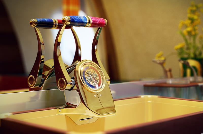 Shagreen “stingray” embellished covers wraps around the valances and tabletops, while the aircraft’s ribbed structure of inlaid brass and wood span the cabin with adjustable lighting. Even the analogue controls, which are typically found in the constraints of a grey remote control, are contained on an engraved brass, gold, silver and platinum fixture.