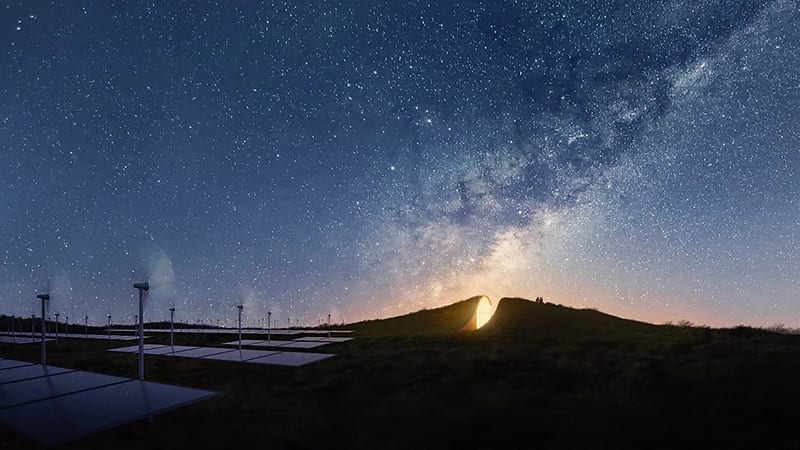 Unplugged with an autonomous power network, the Dune House is charged through a vast solar field and miniature wind turbines, designed to produce more clean energy than what is consumed.