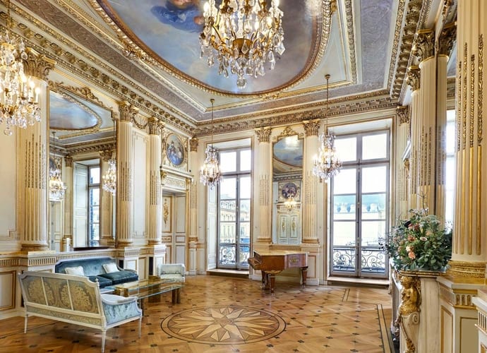 Designed at the request of Baron Baudard de Sainte-James by lead architect François-Joseph Bélanger and a team of artisans prized by King Louis XVI and Queen Marie-Antoinette in 1779, the Salon Chopin is regarded as an exceptional artistic treasure, with invaluable paintings of Lagrenée le Jeune, and the sculpted paneling of anchors, shells and tridents by the Rousseau brothers, lining each wall. As an ode to a former resident’s final mazurka and the salon’s musical identity, the space now also includes a Pleyel piano from the 1920s.