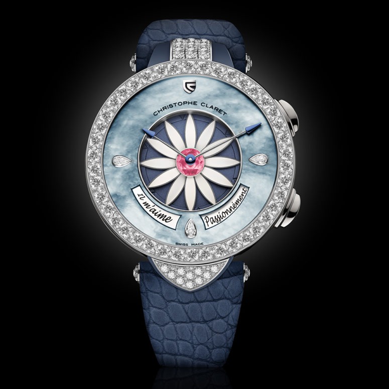 ความรักนั้นบางทีก็ยากจะหาคำตอบจนต้องอาศัยวิธีเสี่ยงทายเพื่อให้ได้รู้ถึงความในใจของฝ่ายตรงข้าม แบรนด์นาฬิกา Christophe Claret จึงนำความโรแมนติกของการเสี่ยงทายดังกล่าวมาสู่เรือนเวลาอีกครั้งกับ Margot Velours นาฬิกาตัวเรือนไวท์โกลด์เคลือบพีวีดีสีฟ้าขนาด 38.40 มม. ประดับเพชรทรงบริลเลียนท์คัทที่ขอบตัวเรือนและขาตัวเรือนอย่างประณีตด้วยเทคนิคสโนว์เซ็ตติ้ง หน้าปัดนาฬิกาสุกสกาวด้วยเปลือกหอยมุกสีฟ้า ตกแต่งด้วยเพชรน้ำงามทรงลูกแพร์ทึ่ตำแหน่ง 3, 6 และ 9 นาฬิกา