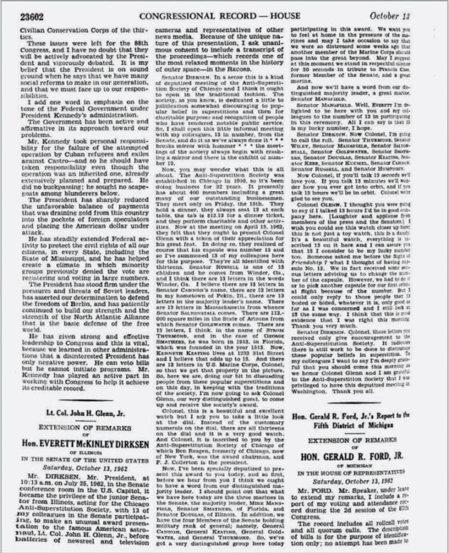ข้ามมาที่ปี ค.ศ. 1962 เลย ในวันศุกร์ที่ 13 เมษายน วุฒิสมาชิกสหรัฐจำนวน 13 คนได้มารวมตัวกันที่สมาคมต่อต้านความเชื่อเหนือธรรมชาติแห่งชิคาโกนี้เพื่อมอบนาฬิกา Lucky 13 ให้แก่จอห์น เกลน ซึ่งเพิ่งจะกลายเป็นชาวอเมริกันคนแรกที่ได้โคจรรอบโลกเมื่อราวสองเดือนก่อนหน้า ด้วยยานอวกาศหมายเลข 13 ในภารกิจ Friendship 7 ดังจะเห็นได้ว่าหน้าปัดของนาฬิกาเรือนนี้ใช้เลข 13 ในทุกตำแหน่งชั่วโมง และตามบันทึกถ้อยคำของสภาคองเกรสในวันที่มีพิธีมอบนาฬิกานั้นก็ปรากฏด้วยว่าจอห์น เกลน เชื่อว่าเลข 13 เป็นเลขนำโชคสำหรับเขาจริงๆ