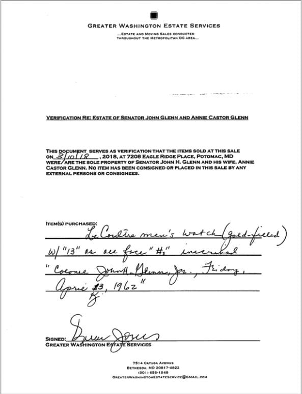 เอกสารยืนยันการขายนาฬิกาออกจากกองมรดกของจอห์น เกลน